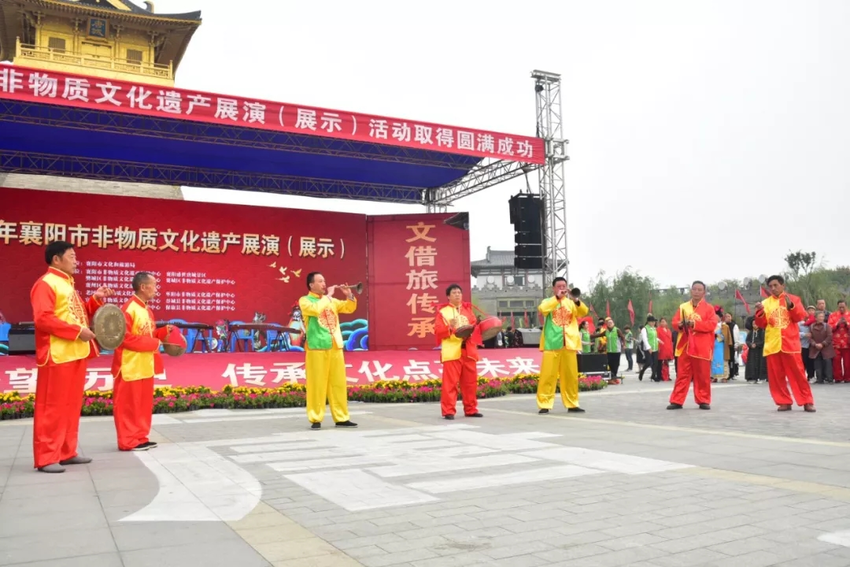 图为非遗传承人谭长禄(左五)带领团队参加襄阳市非物质文化遗产展演。