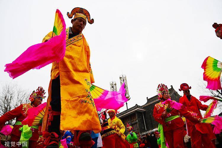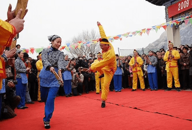 高跷也称“高跷秧歌”,是一种历史悠久的民间舞蹈,因表演时多用双脚踩踏木跷而得名。高跷一般以舞队的形式表演,参演者十数人至数十人不等,多扮演古代神话或历史故事中的人物,服饰多模仿戏曲行头,演出中常用的道具包括扇子、手绢、木棍、刀枪等。高跷有“踩街”和“撂场”两种表演形式,其中“撂场”又分“大场”和“小场”两种。“大场”由舞队集体表演,边舞边走各种队形图案;“小场”由两三人表演,多为男女对舞,有时边舞边唱。