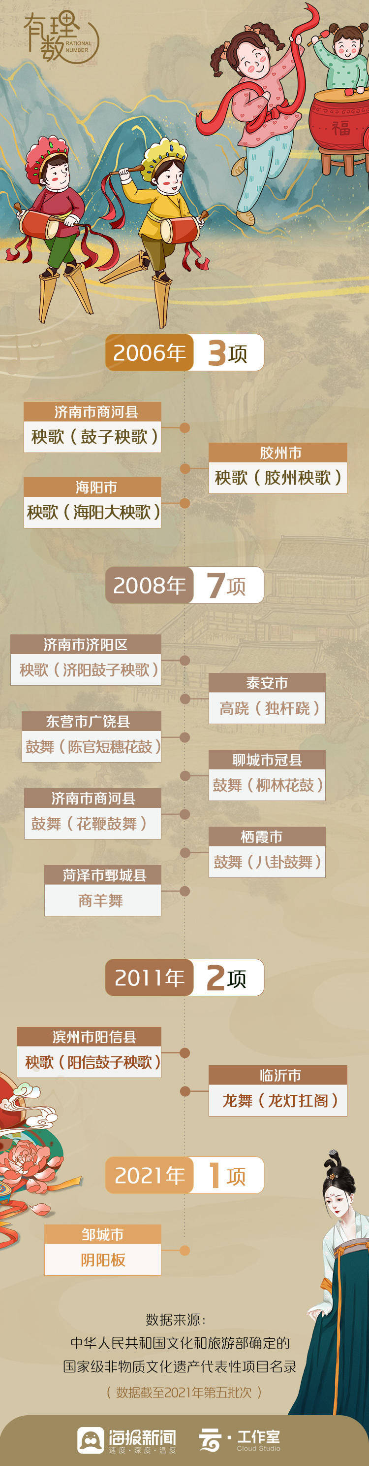 按照山东传统舞蹈被评为国家级非遗评定的年份划分来看,分别为:2006年3项;2008年7项 ;2011年2项 ;2021年1项。
